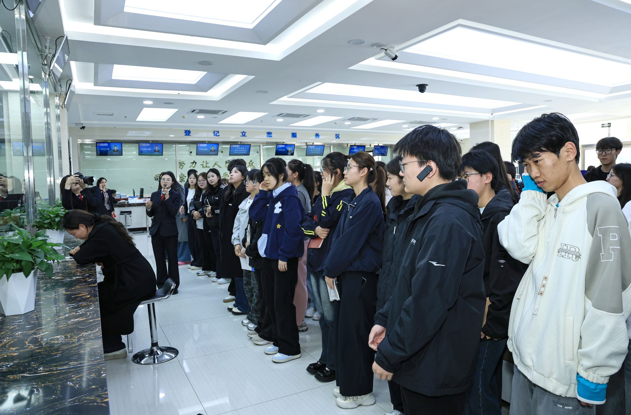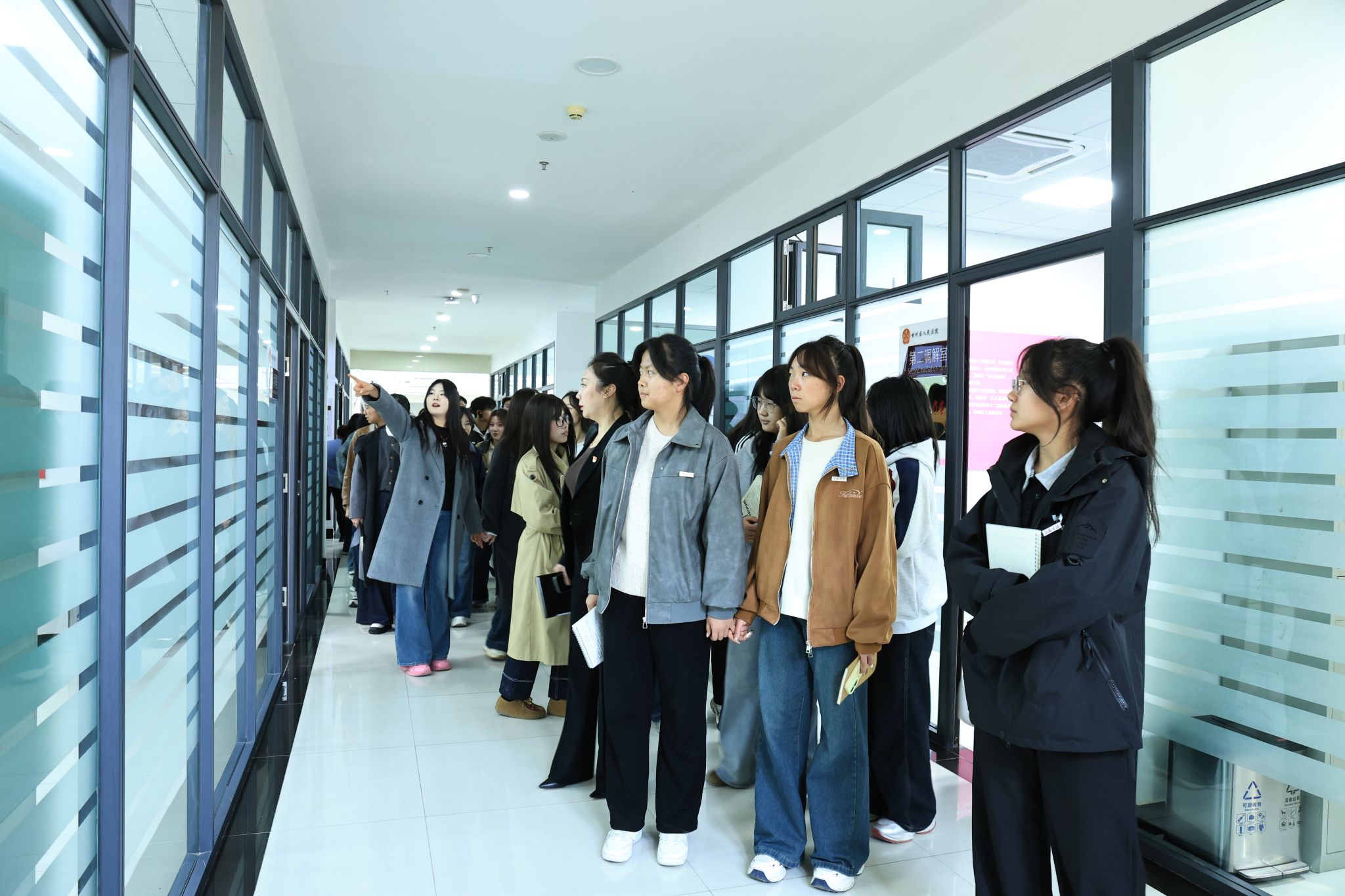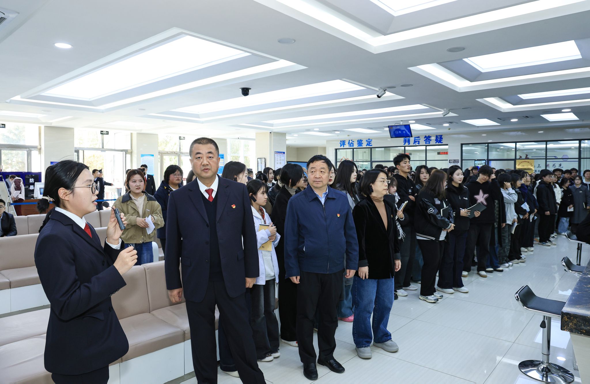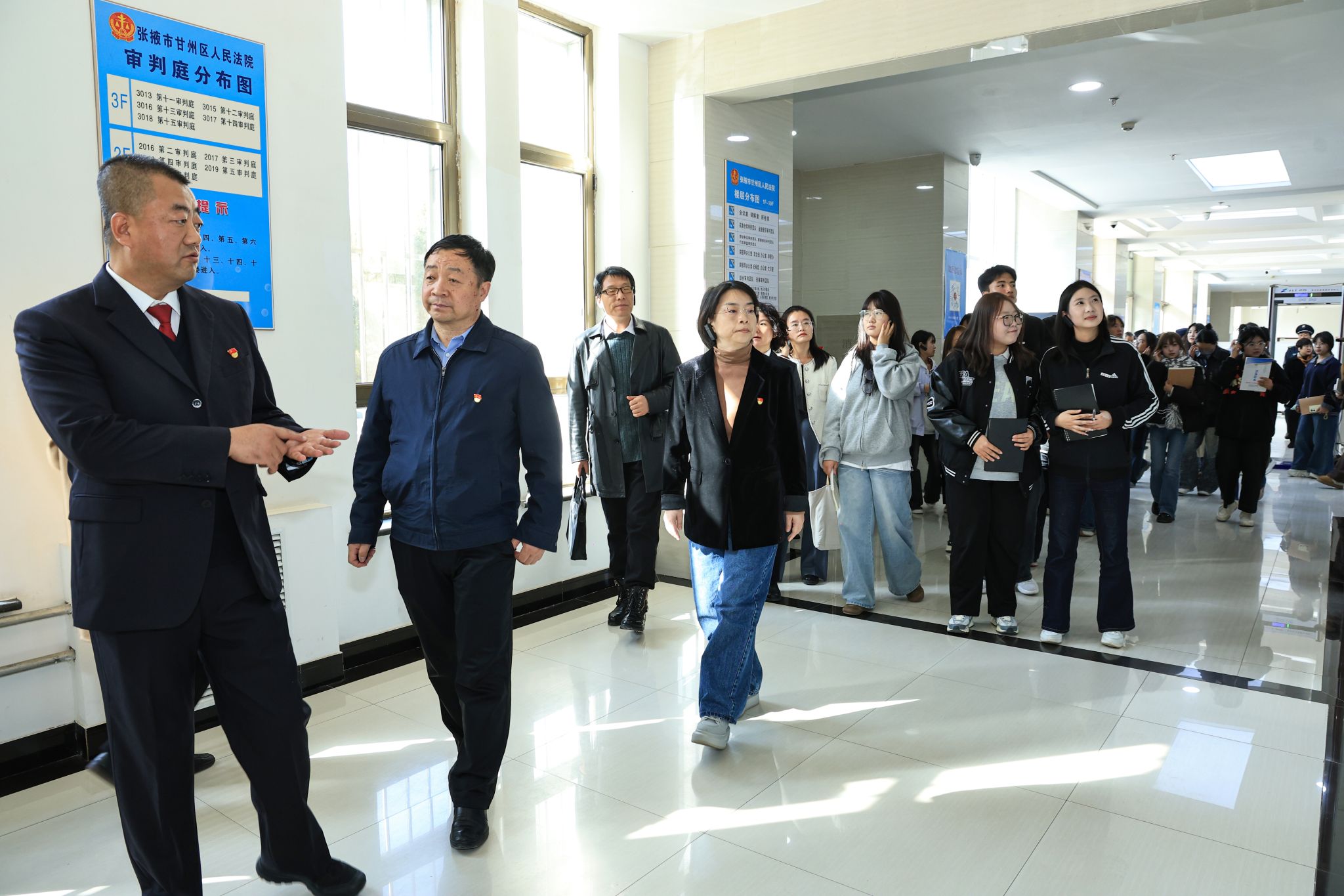 师生们在法院干警的引导下实地参观了甘州区人民法院诉讼服务中心、审判庭、执行指挥中心及党建文化长廊等。通过了解“一站式”诉讼服务流程、智慧法院建设成果及党建工作成效,员工们“零距离”感受司法为民的温度与科技赋能的效率,干警们严谨的职业素养和对法治信仰的坚守令在场师生深受触动。